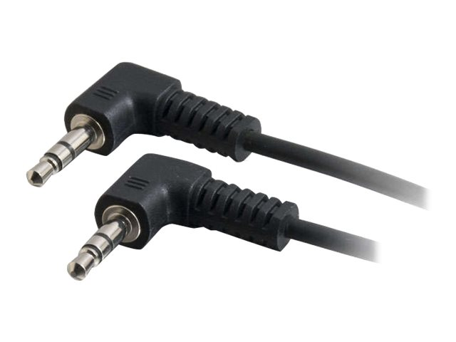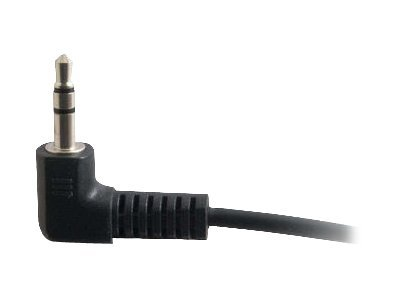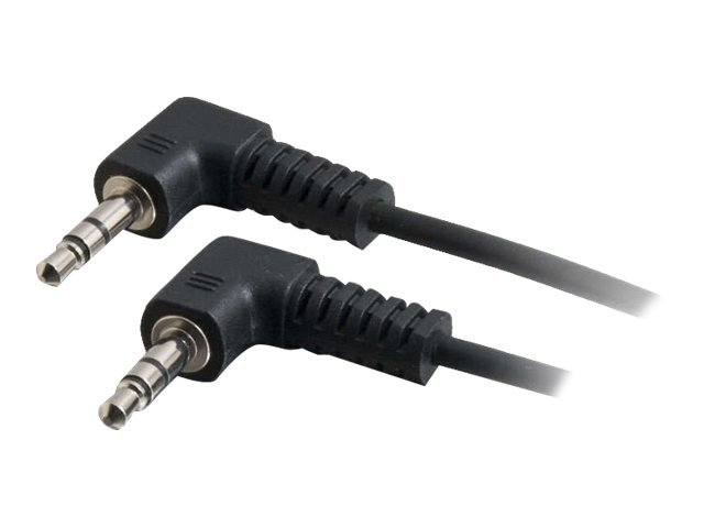 The C2G "Value Series" stereo right angle audio cable is specifically designed to provide a brilliant audio experience. It connects a PC sound card, portable CD player or any mini-stereo audio device to a multimedia speaker. This cable features two copper conductors and a drain wire. The conductors and drain wire are wrapped with an aluminum Mylar shield which prevents unwanted EMI/RFI interference. Fully molded nickel-plated connectors provide excellent strain relief for durable use.