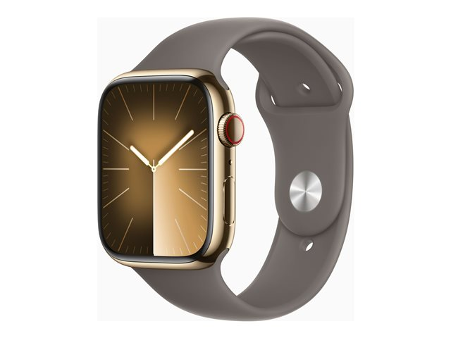 45 mm - gyllen rustfritt stål - smartklokke med sportsbånd - fluorelastomer - leire - båndbredde: M/L - 64 GB - Wi-Fi, Bluetooth, UWB, LTE - 4G - 51.5 g