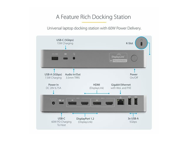 Transform your laptop into a dual-4K 60Hz workstation with this universal laptop docking station, for USB-C and USB 3.0 laptops. Connect to dual DisplayPort or HDMI monitors. Attach USB devices with four USB 3.0 ports. Plus, power your USB-C laptop with 60W Power Delivery.
