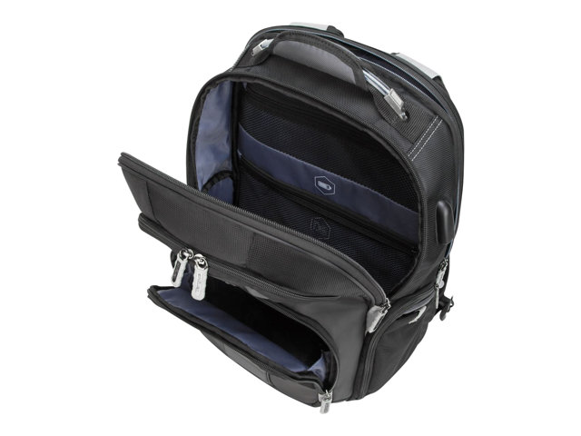 Versatility, comfort, and convenience reign supreme in this durable, travel-worthy pack. Secure and protect your laptop with room to spare for your gear, gadgets, and other essentials. Intelligent organization features include two spacious interior compartments and an easy-access exterior pocket for quick-grab items. Count on comfortable carrying thanks to the ergonomically designed hinged shoulder-strap system, cooling air mesh back panel, and soft, padded carry handle. The unique, sturdy design delivers tip-proof, stand-up appeal and convenience.